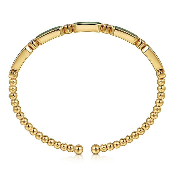 14K Yellow Gold 6.25" Geometric Bangle Style Bracelet Featuring Malachite and Diamonds with a Beaded Polished Finish.
