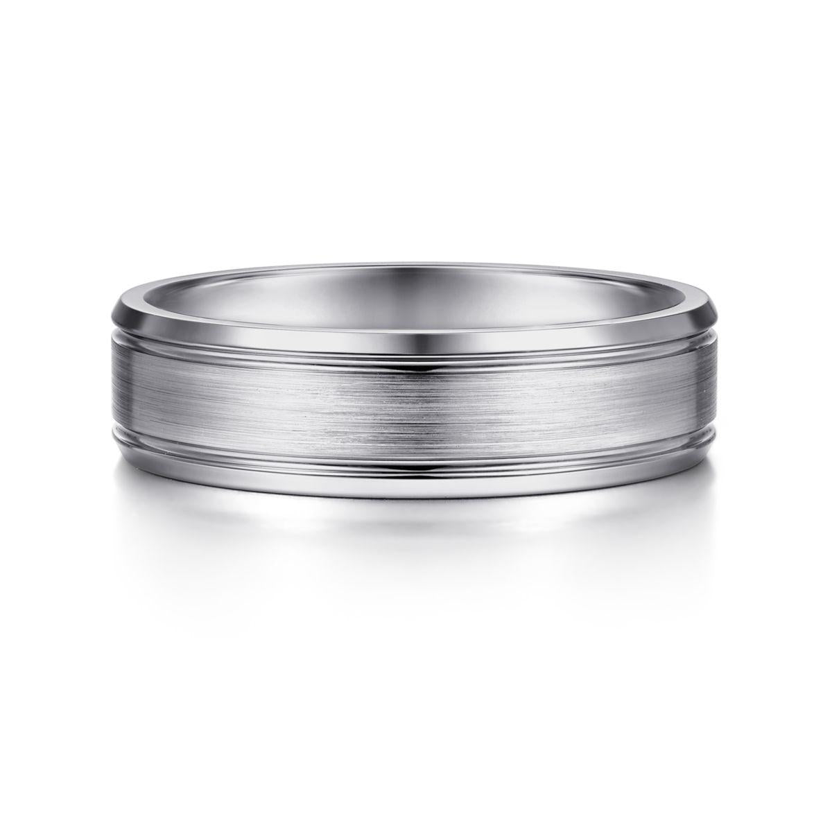14K White Gold 6mm Wedding Band with Grooves and Beveled Edges .