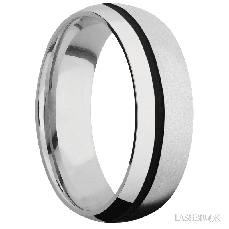 7 mm wide/Domed/Cobalt Chrome band with one 1 mm Off Center inlay of Black.