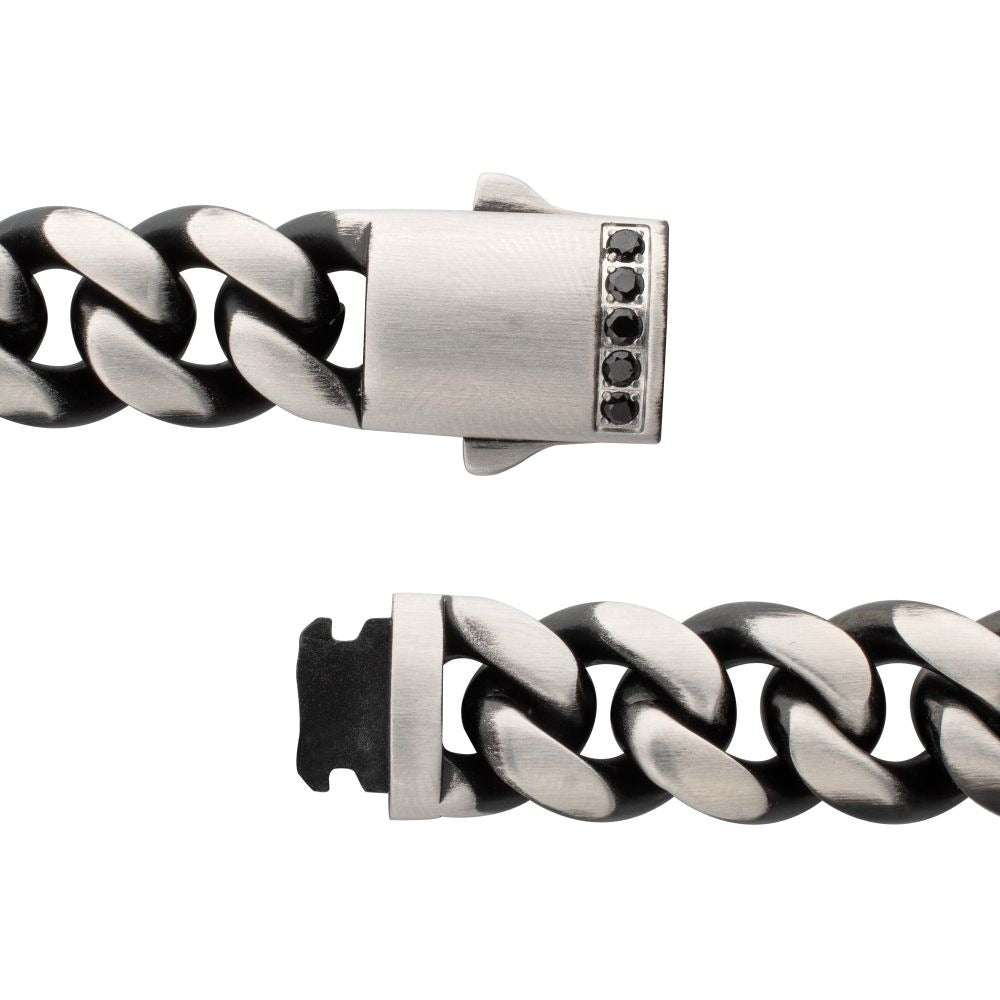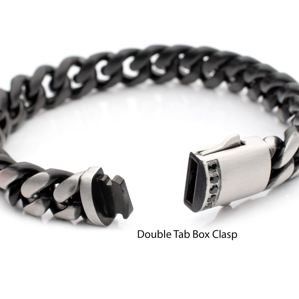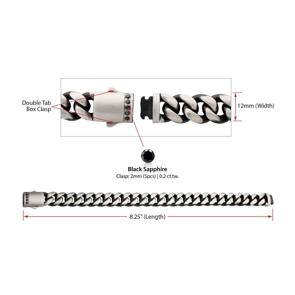 Inox Black IP Stainless Steel 12mm Cuban Chain Link Bracelet Secured by the Means of a Double Tab Box Clasp Featuring Black Sapphire