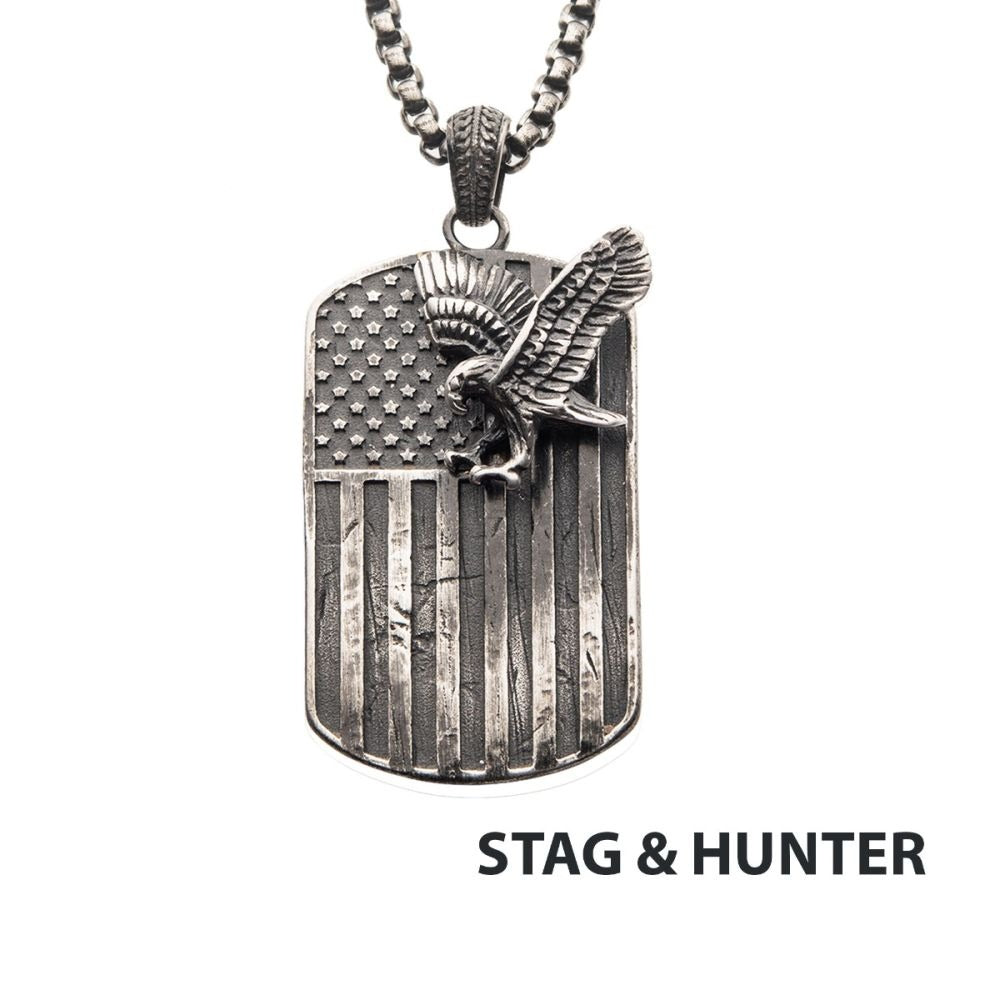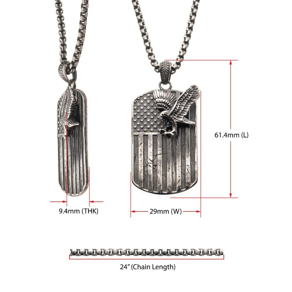 Inox Gun Metal IP Stainless Steel and Stainless Steel 3.5mm Box Chain American Flag Eagle Pendant Secured by the Means of a Lobster Claw Clasp