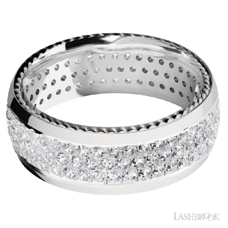 8 mm wide/Domed/14K White Gold band with two 1 mm Sidebraid inlays of 14K White Gold and featuring a 3 Row Eternity arrangement of .015 carat Round Diamond stones in a Bead Channel setting