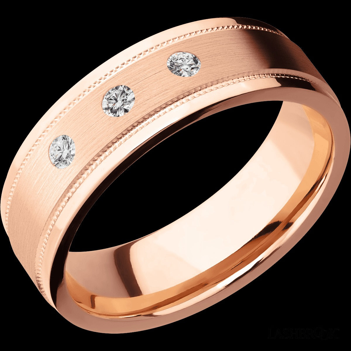 14K Rose Gold 7mm Flat Wedding Band with Step Down Edges Featuring Three Round Diamonds in a Flush Setting.